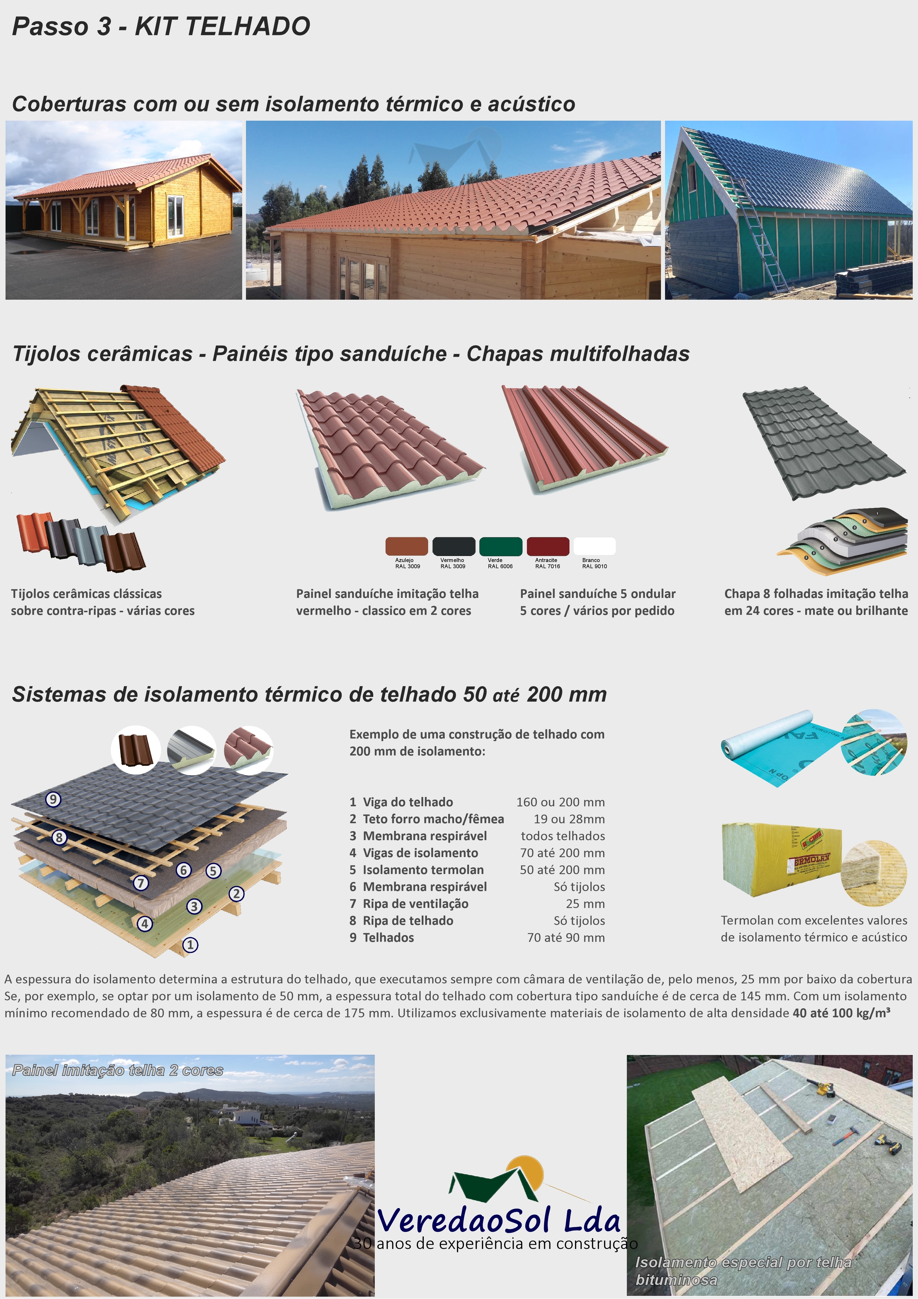 Agora que a instalação da cablagem elétrica na zona do telhado também está concluída, podemos, se desejarmos, montar o telhado completo, para além do que foi feito no passo 2. O KIT TELHADO standard inclui uma cobertura com painéis sanduíche de 5 ondas e isolamento do telhado com ventilação, com uma espessura mínima de 50 mm. O telhado fica assim isolado não só termicamente, mas também acusticamente. Outras opções, como tijolos clássicos, telhas tipo sanduíche e placas imitação de tijolos, com isolamento térmico e acústico até 200 mm, completam o kit. O edifício está agora protegido a longo prazo da chuva e do tempo tempestuoso. A pintura exterior e os trabalhos de acabamento interior podem ser realizados a qualquer momento posteriormente.