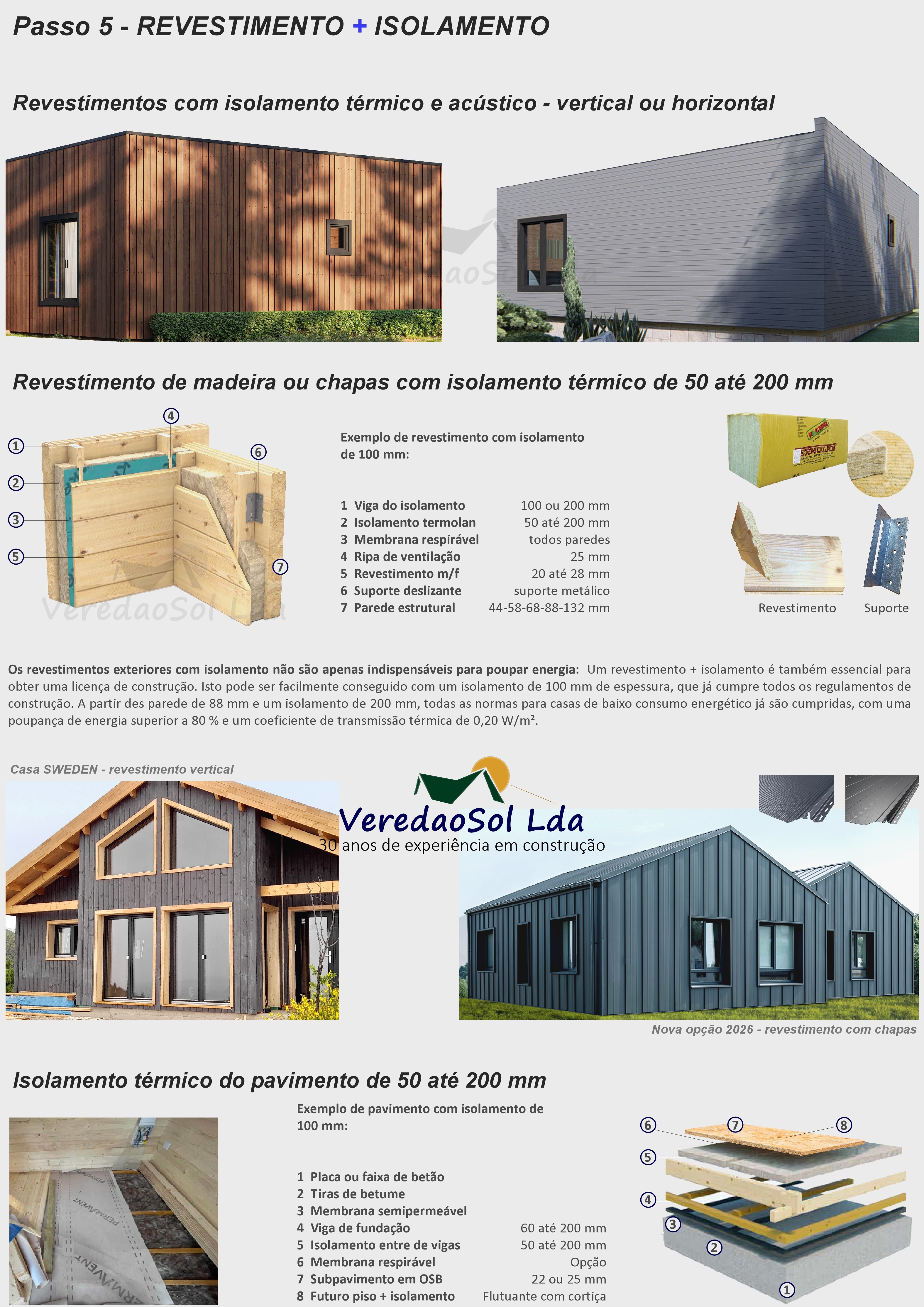Dependendo do tipo de construção, poderá ser necessária uma parede exterior adicional, especialmente para garantir uma proteção ideal a uma casa de madeira contra condições meteorológicas adversas, como chuva forte. A proteção total contra a chuva só é garantida em casas de madeira com paredes com, pelo menos, 88 mm de espessura. Embora a maioria das casas com paredes de 58 a 68 mm não tenha problemas durante chuvas fortes, as paredes altas das empenas, em particular, devem ser equipadas com um revestimento adicional, que pode ser construído com ou sem isolamento. Os revestimentos exteriores adicionais, com ou sem isolamento, e os isolamentos de pavimentos, são descritos no Passo 5. O revestimento pode ser instalado diretamente ou numa data posterior. Em edifícios com licença de construção, é necessário um revestimento exterior com 100 mm de isolamento para cumprir os regulamentos de construção portugueses. Teremos todo o prazer em aconselhá-lo...
