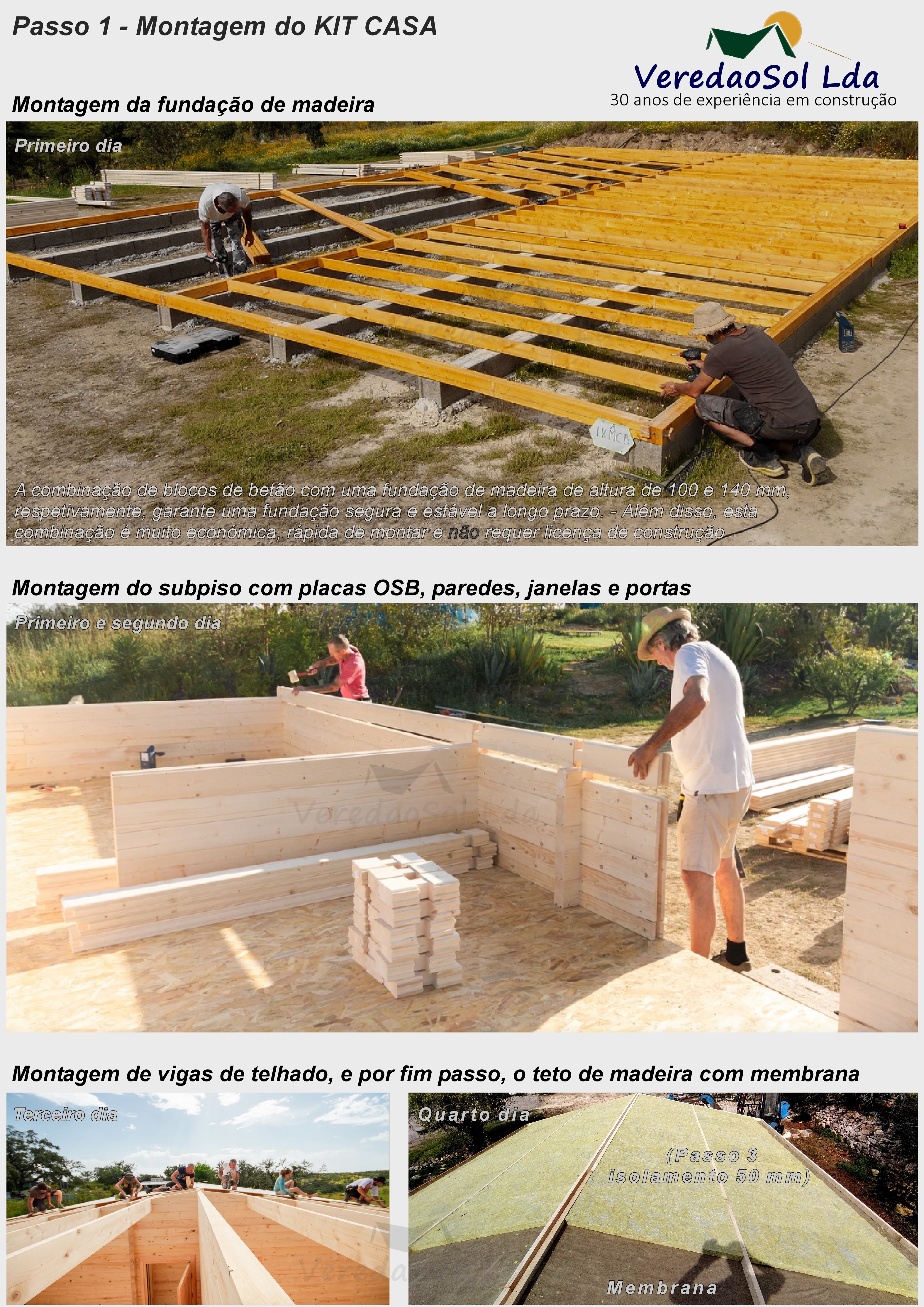 Isto kit inclui a montagem do KIT CASA encomendado, incluindo vigas de fundação em madeira, placas de subpavimento OSB, paredes, portas, janelas, vigas de telhado e tábuas de telhado, sobre uma fundação pré-construída. Por exemplo, sobre uma fundação em faixa com capacidade de suporte de carga a longo prazo, que já tenha sido construída. Os trabalhos de montagem do KIT CASA são concluídos no prazo de 3 a 4 dias úteis. Por fim, é instalada uma membrana respirável no telhado, para que a casa fique protegida da chuva durante as próximas 6 semanas e tenha tempo suficiente para instalar você mesmo a cobertura necessária.