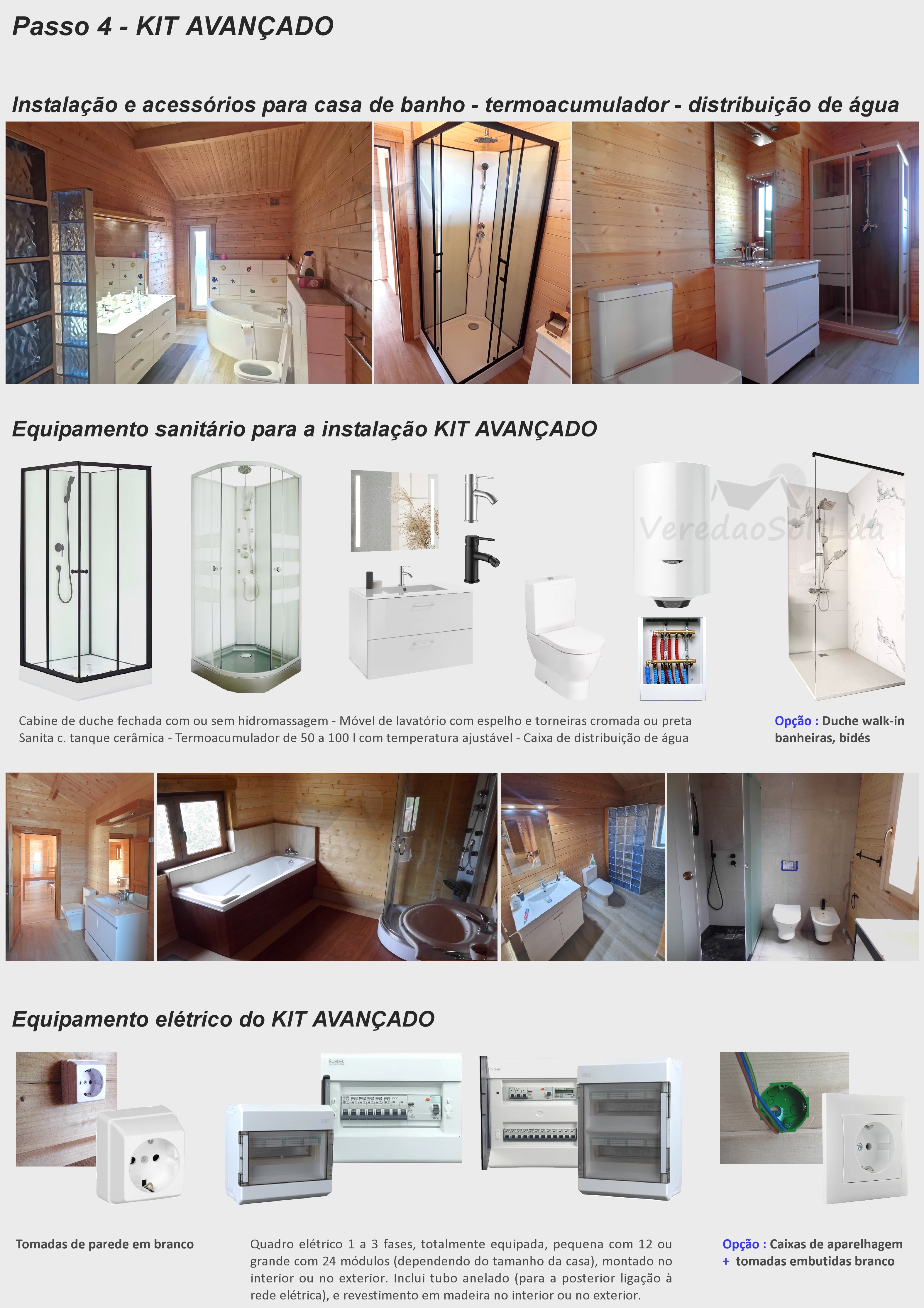 Isto inclui os trabalhos e materiais mais complexos necessários para deixar a casa pronta a habitar. Por exemplo, a instalação completa dos sistemas elétricos, da caixa de fusíveis e das tomadas - o abastecimento de água e o aquecedor - e acabamento completo das casas de banho com cabina de duche fechada, sanita e lavatório. (Para permitir a instalação dos elementos sanitários, instalamos primeiro um laminado impermeável nas casas de banho.) Os trabalhos da passo 4 demoram, em média, mais 10 dias úteis. Podem ser selecionadas opções adicionais, como a montagem uma duche walk-in banheiras, bidés e piso radiante.