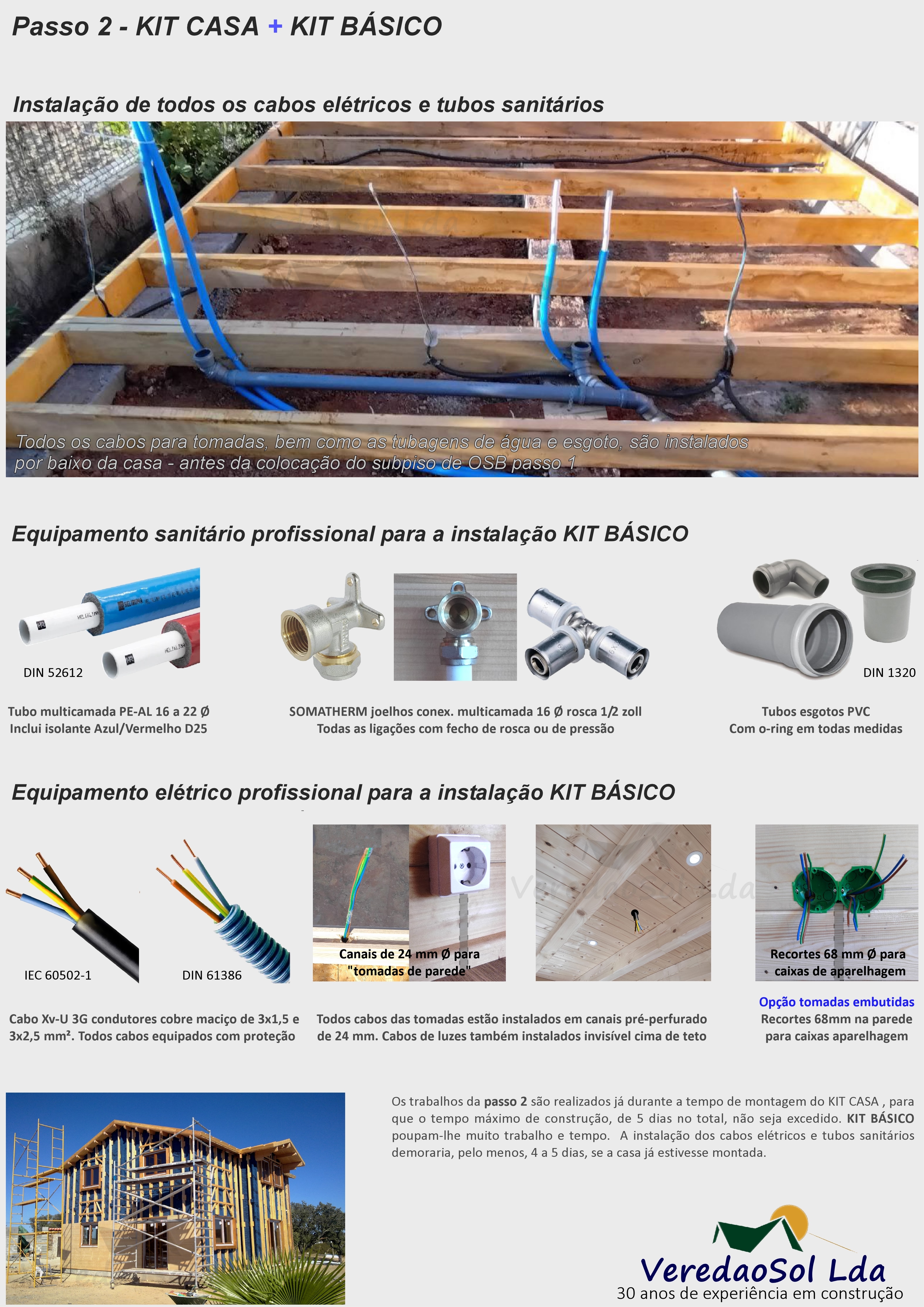 Isto inclui todos os trabalhos básicos necessários para as ligações elétricas e sanitárias. Instalamos todos os cabos elétricos para futuras tomadas e luzes de teto, bem como para aparelhos adicionais, tais como aquecedores de água e fornos, e todos os tubos de água e esgoto para ligar futuras instalações sanitárias. Os trabalhos da passo 2 são realizados durante montagem KIT CASA de modo a não exceder o tempo máximo de construção de 5 dias no total. O KIT BÁSICO poupa-lhe muito trabalho e tempo, uma vez que as instalações elétricas e de canalização demorariam, de outra forma, pelo menos 4 a 5 dias após a montagem da casa.